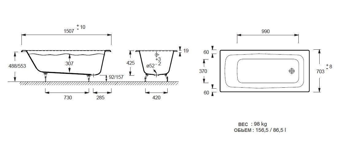 Комплектующие для Ванна чугунная Jacob Delafon Ultima E6D109 150*70
