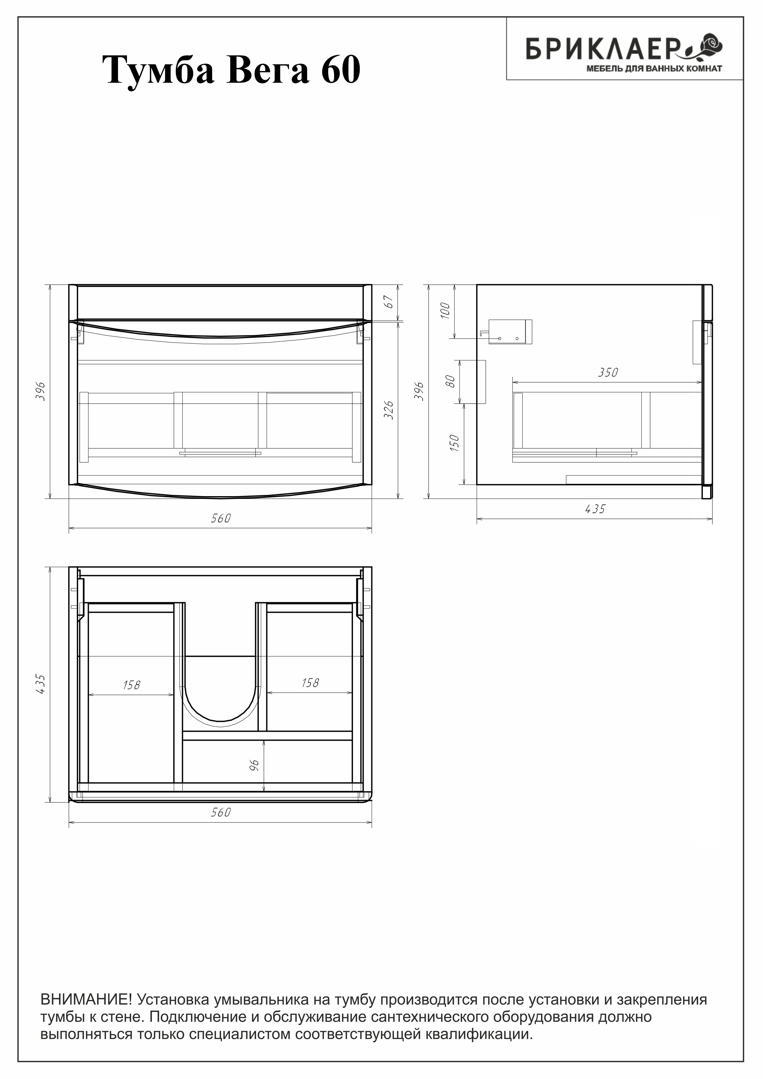 Тумба с раковиной Бриклаер Вега 60 белый глянец