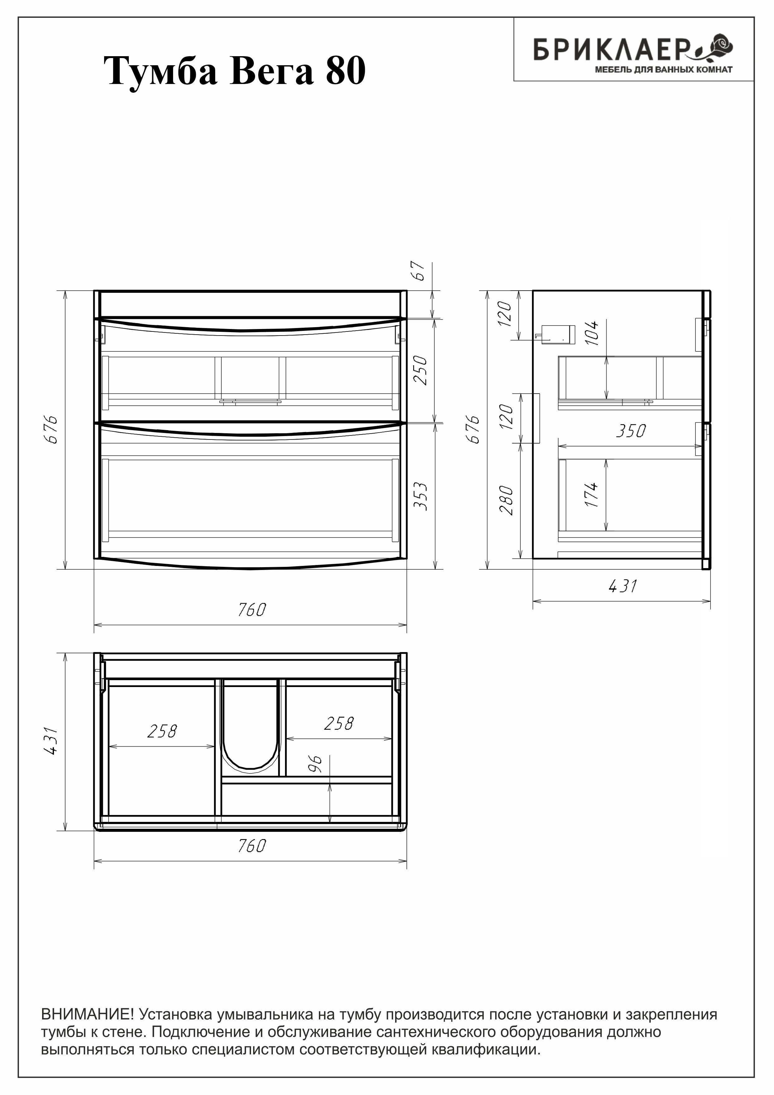 Тумба с раковиной Бриклаер Вега 80 белый глянец