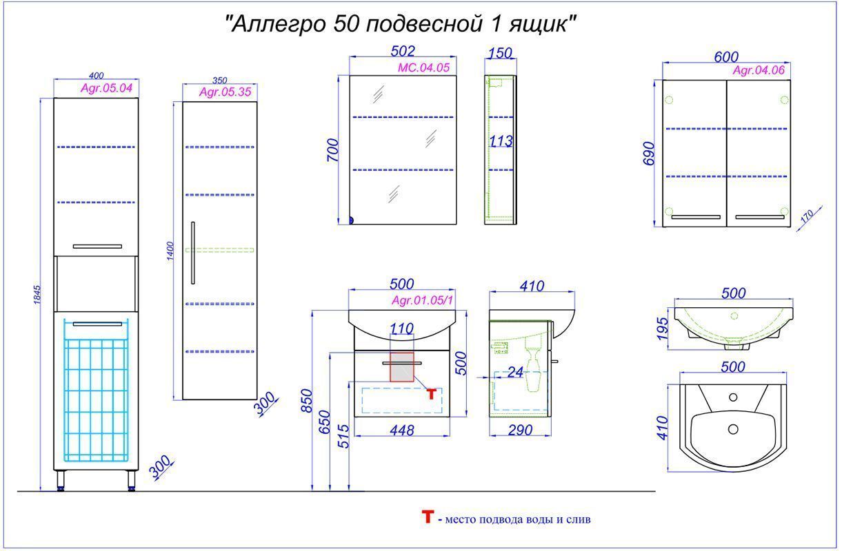 Мебель для ванной Aqwella Аллегро 50 белая подвесная, 1 ящик