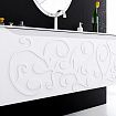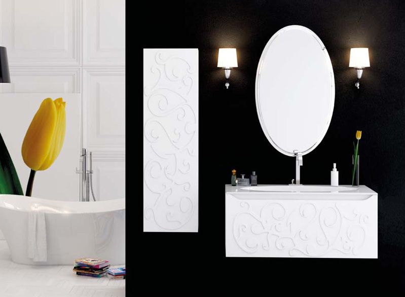 • Модель также может комплектоваться зеркальными шкафами в размерах 100 и 120 см, отличительными особенностями которых являются: сенсорный выключатель, реагирующий на движение рукой в нижней части шкафа; фоновое освещение зеркального полотна по периметру. В качестве основного источника света используется LED-светильник в металлическом корпусе.